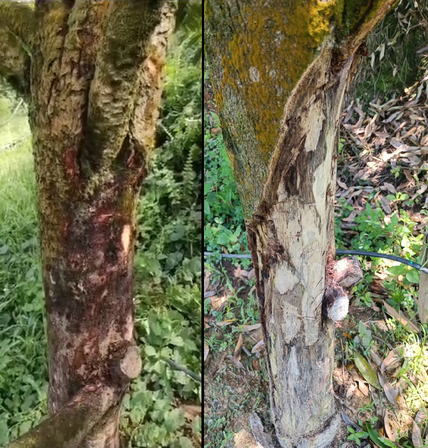 Left: Durian with serious canker before treatment. Right: 4 months after BR treatment.